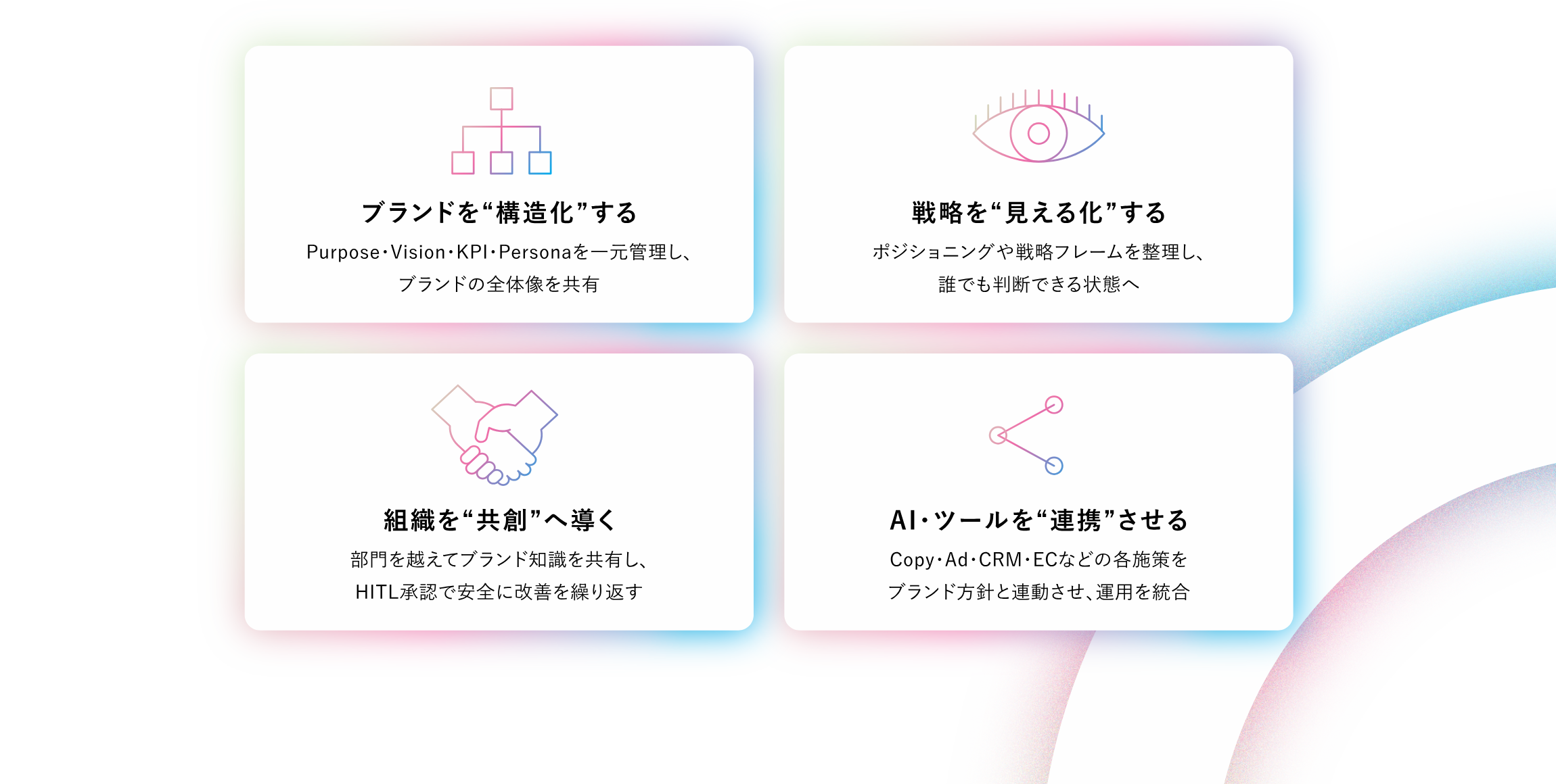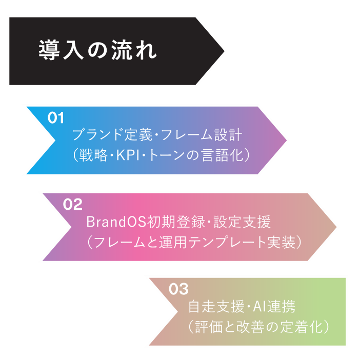 ブランドの考え方や判断軸を、組織と AI が共有できるようにすること。BrandOS はそのためのフレームワークを提供します。
