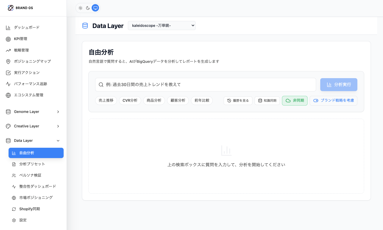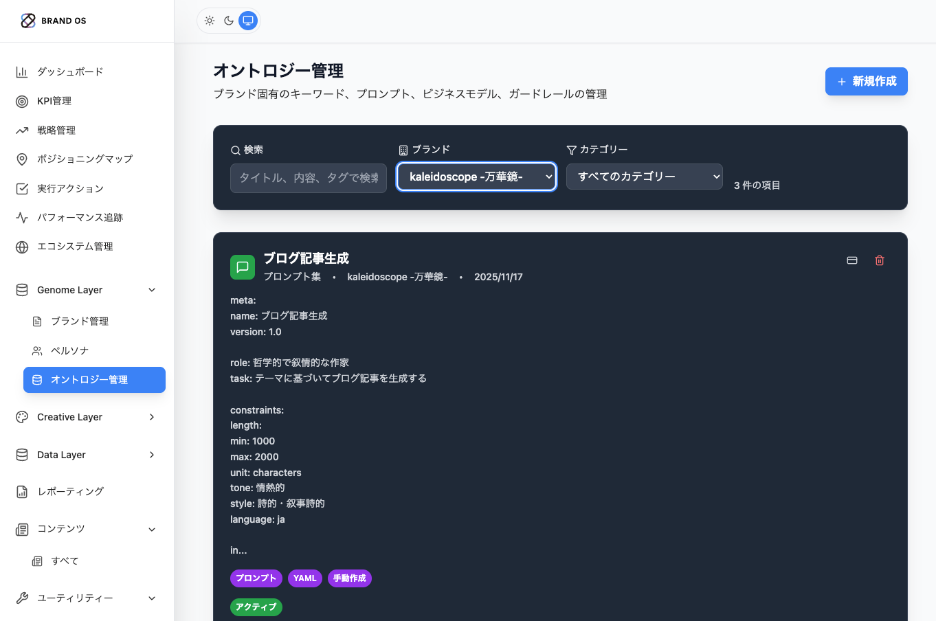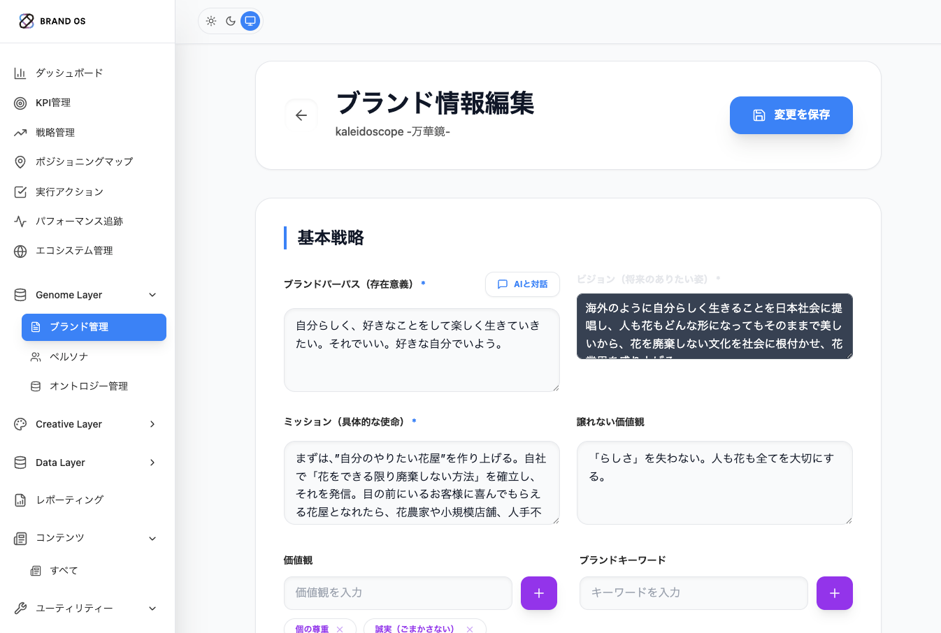 GenomeLayerは、ブランドの核となる理念・価値観・行動原則を構造化し、AIやチーム全体が共有できる知識層。ブランドの“思考DNA”を形成し、すべての施策判断の基盤となります。