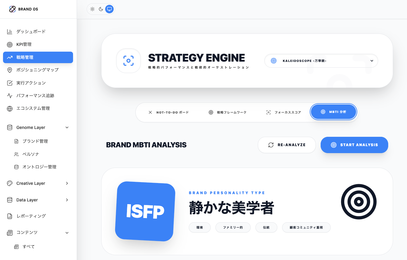 ポーターやブルーオーシャンなどのフレームを用いて、ブランド戦略を構造化。方向性を明文化し、チーム全体で共有できます。ブランドMBTI分析による診断も可能です。