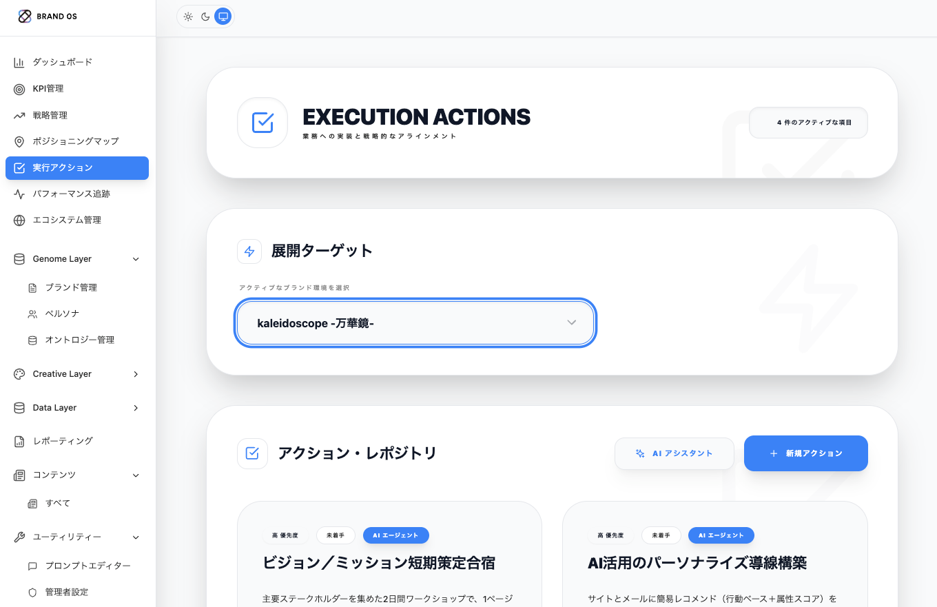 戦略から導かれる具体的なアクションを整理・管理。担当・期限・進捗を一元化し、AIが優先度を判断。ブランド戦略の実行力を高めます。