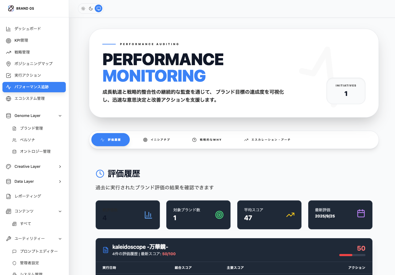 KPIや施策進捗をリアルタイムで可視化。戦略との整合性をAIが自動分析し、改善点や次の一手を提案します。ブランド成長の“現在地”を把握する中枢です。