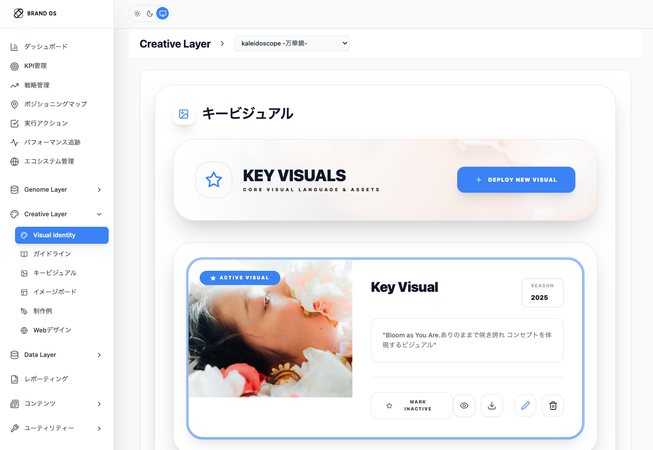 Creative Layerは、ブランドの世界観や表現ルールを構造化し、チームやAIが共有できるクリエイティブ知識層。ロゴやカラー、ガイドラインなどの表現資産を一元化し、すべてのアウトプットに一貫したブランド体験を与えます。